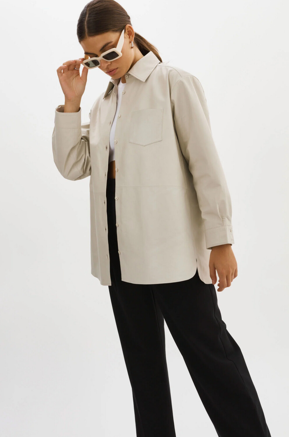 The Lamarque Estelle Leather Oversized Shirt Jacket will indulge you in the epitome of luxury with this ultra-versatile oversized button-front shirt. Perfect for the ultimate model-off-duty look, it has a utilitarian-inspired cut and is made from buttery soft lightweight leather. Wear it traditionally, layered over a classic tank or with the matching shorts for a sleek finish.