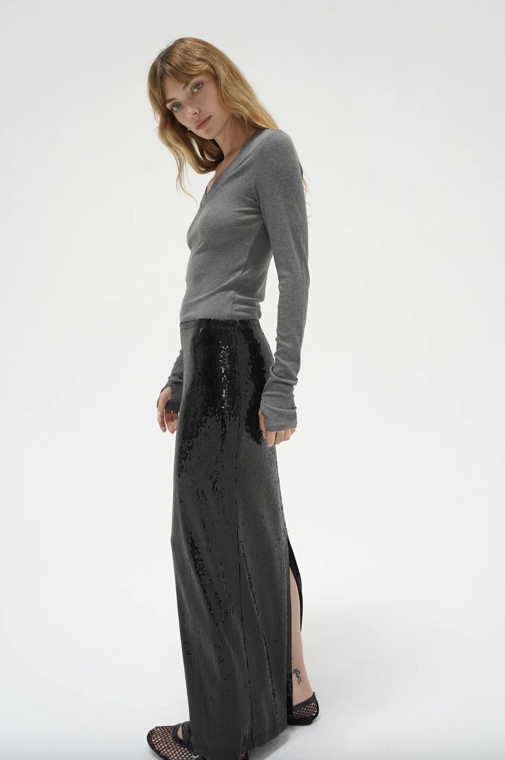 The LNA Elinda Rib Sweater is a long sleeve rib sweater with a V-neck and arm thumbholes. This close fitting, super soft sweater is easy to dress up or down.
