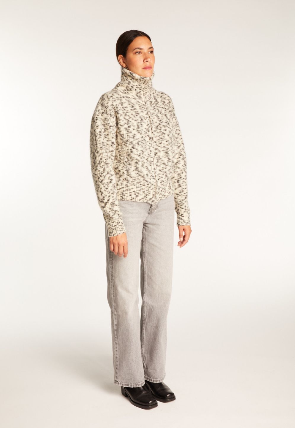 The Maison Montagut Valentine Zip-up Sweater in Leo Ecru is a chic essential. Designed to offer warmth and elegance, this jacket combines the luxury of mohair wool with a modern cut and practical zip. Perfect for cold days, it instantly adapts to any outfit, day or night.