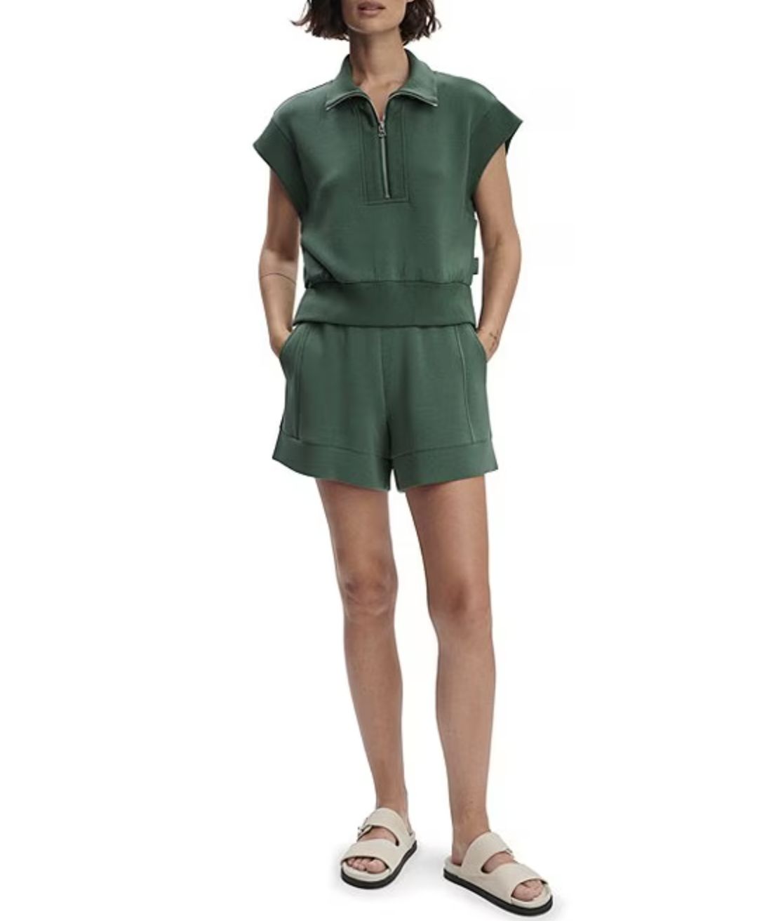 The Varley Kelly Half Zip Short Sleeve Sweat is made in Varley's signature DoubleSoft® fabric with a high neck collar in rib, as well as a rib panel around the zip, and rib trims on the neck collar and armholes. Its cropped design and grown on sleeves give it a contemporary air, while the rib hemband with side splits adds intricate details. It has an easy, relaxed fit.